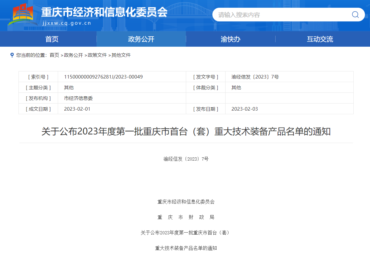 2023年2月,我司五款產品入選“2023年度第一批重慶市首臺(套)重大技術裝備產品”名單