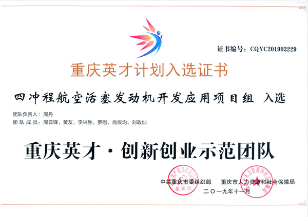2019年11月,我司四沖程航空活塞發(fā)動(dòng)機(jī)開(kāi)發(fā)應(yīng)用項(xiàng)目組被評(píng)為“重慶英才.創(chuàng)新創(chuàng)業(yè)示范團(tuán)隊(duì)”